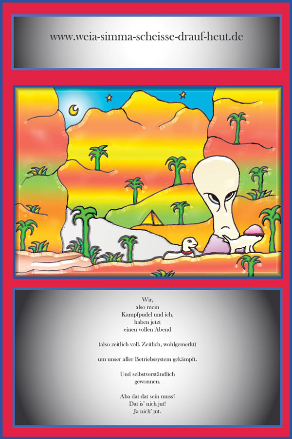 Wir, also mein Kampfpudel und ich, haben jetzt einen vollen Abend (also zeitlich voll. Zeitlich, wohlgemerkt) um unser aller Betriebssystem gekämpft. Und selbstverständlich gewonnen. Aba dat dat sein muss! Dat is’ nich jut! Ja nich’ jut.