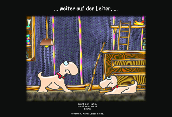 kräht der Hahn. Hund kann nicht drahn kommen. Kann Leiter nicht.